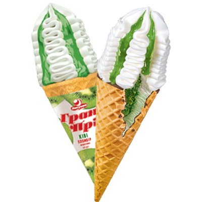 У спекотній літній день дивовижно освіжує морозиво зі шматочками справжніх фруктів, наприклад таке, як "Гран-Прі" ківі. Незвичайне поєднання тропічного ківі і найніжнішого вершкового пломбіру стане до вподоби навіть найрозпещеному ласуну. Гармонійне поєднання солодкого натурального пломбіру і кислинки ківі робить морозиво ще більш освіжаючим. Хрусткий вафельний ріжок покритий всередині тонким шаром найсмачнішого шоколаду, а сам пломбір начебто пронизаний прошарками джему зі шматочками ківі. Справді, райське поєднання!